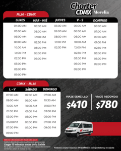 🚌 Salidas diarias De Morelia a Ciudad de México: $400 viaje sencillo y $725 viaje redondo por adulto. De Morelia a Guadalajara: $410 viaje sencillo y $780 viaje redondo por adulto.